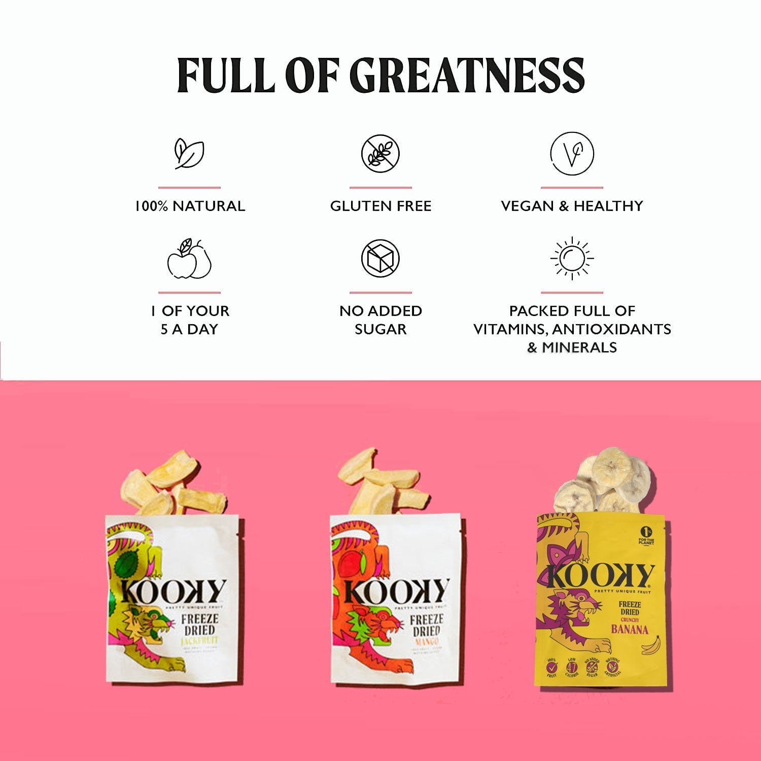 In today's fast-paced world, convenience is key. Freeze-dried fruits are the ultimate on-the-go snack, requiring no preparation or refrigeration. Lightweight, non-perishable, and perfect for busy lifestyles—all in our stylish & artistic Kooky packaging!