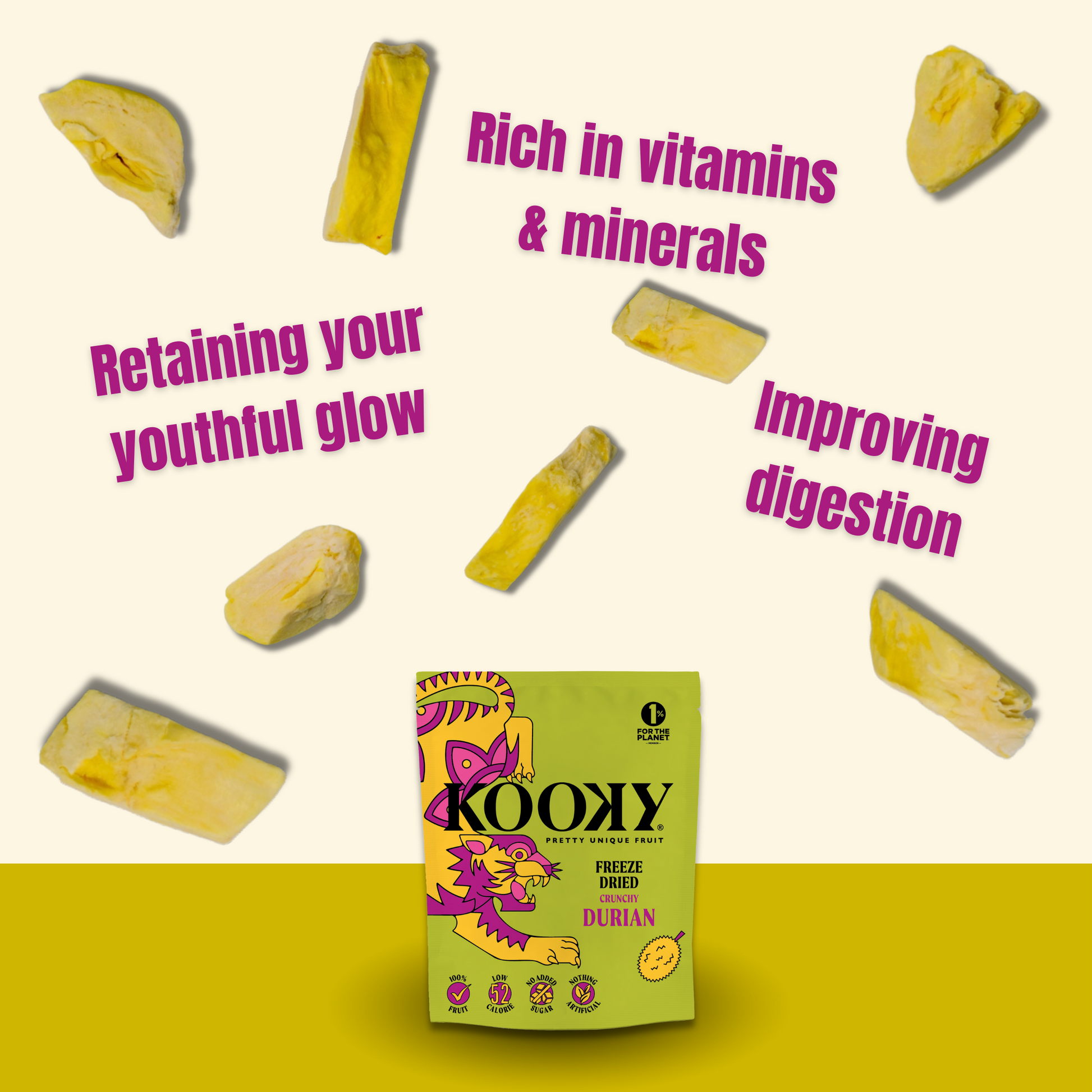 The fruit’s texture is described as soft and creamy, and its flavour can vary from sweet and rich like caramel to slightly savoury, or even bitter, depending on the variety. It is typically eaten fresh but it can also be used in sweets, ice cream and savoury dishes. At Kooky, true to our reputation of always selecting the most premium fruit varieties, our freeze dried pouches are packed with the famous Royal Thai Monthong durian with a unique flavour that blend of sweet & savoury notes.