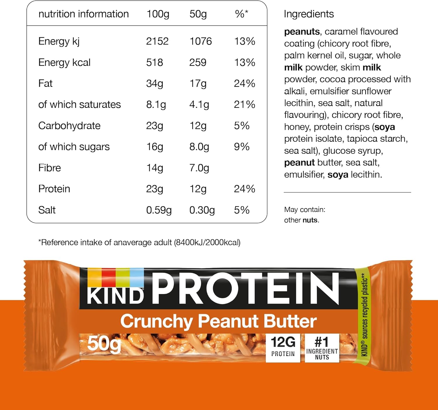 KIND is more than just a name. It’s a commitment: to making snack bars that don’t compromise. Just the best ingredients. And always packed with flavour. KIND Protein bars are high in fibre and packed with 12g protein in every bar. Crunchy Peanut Butter is the perfect blend of smooth peanut butter with the added crunch of whole peanuts.